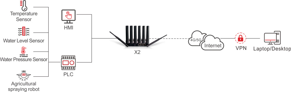 The impact of 5G on the farm is its at-scale facilitation of technologies such as the IoT, AI, edge computing, drones and autonomous vehicles. 5G could let farmers deploy IoT sensors devices in the fields at scale.With autonomous drones connect to Hongdian A50M 4G/5G Router, the farmer can manage and operate autonomous drones. Hongdian A50M 4G/5G router provides high-speed data exchange, support the RS232/RS485 interface of DTU/Modbus, and can connect a large number of accessible devices through Hongdian Wedora platform. Hongdian Router OS provides advanced functions such as OPENVPN, IPSec, SMS, LinkBackup, LinkSwitch, to ensure the autonomous drones use and operation process stable and safe. It can switch on and off the field water valve in real time and monitor the state in real time. Through this equipment, can realize many functions such as automatic collection of water consumption, real-time monitoring of images, achieving the purpose of saving irrigation water, and scientific and efficient management of irrigation area. The management personnel can manage the site through the management platform.
