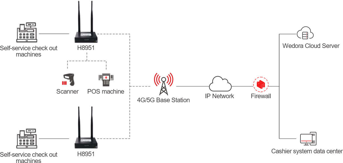 By adding Hongdian cellular 4G/5G routers A50M to existing self-checkout machines, the problem of lost connections can be easily solved.It can also provide WIFI network for handheld POS machines and other wireless code scanning devices in shopping malls.Once it detects a wired WAN loss or outage, it automatically switches to 4G LTE as an Internet source, providing continuous Internet service to connected devices.